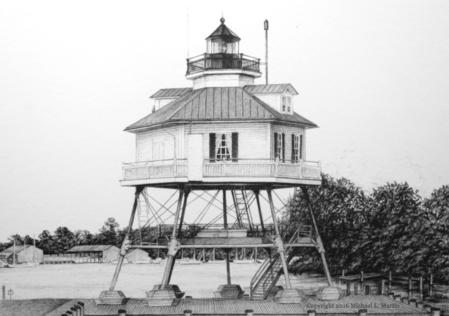 The Piney Point lighthouse was erected in 1836. Originally, the light could be seen for 10 nautical miles. The lighthouse was visited by several United States presidents and other dignitaries. The location is also home to a shipwrecked German U-Boat. The lighthouse was decommissioned in 1964. To find out more about Piney Point, to visit the site, or purchase this and other works through their store, visit